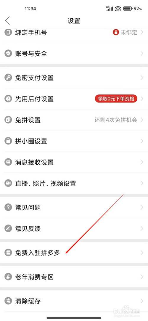 3、进入设置,点击免费入驻拼多多即可
