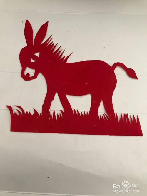 第六步 剪完外围多余的彩纸之后 再剪里面的细节部分 比如小毛驴的眼部 嘴巴的镂空部分 还有其它涂实的部分 最后剪下边的小草 都剪完之后 修理一下 一头可爱的小毛驴就裁剪完成了