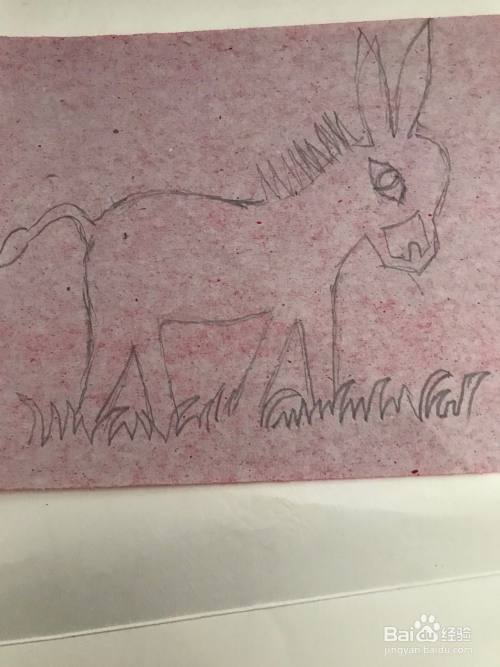 第三步 画完小毛驴的头部轮廓之后 再继续画上它的眼睛 嘴巴 脖子 鬃毛和全身还有它的四条腿 以及地上的小草等等