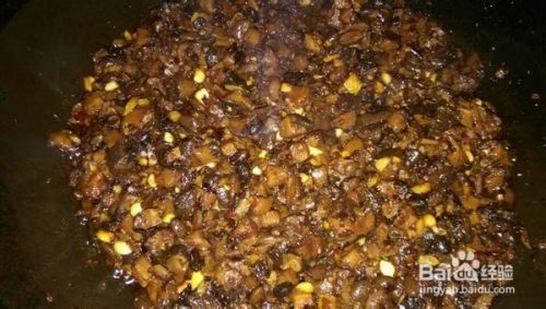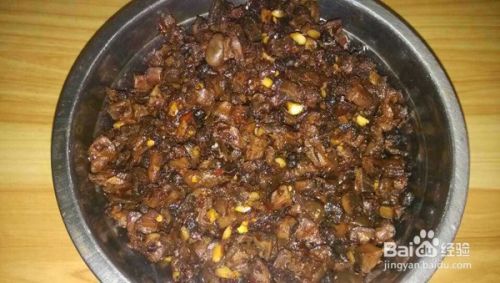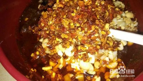然后按顺序放入豆豉,辣椒油,花生米,食盐翻炒3分钟,就可以出锅啦。