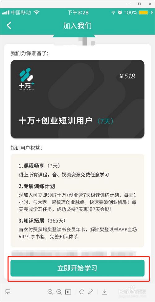 7.接下来点击页面中的“立即开始学习”就可以支付开通,成为短训用户了。短训用户的权益包括:1、七天全场课程音频视频免费学;2、连续打卡7天送永久课程;3、首次开通送价值365元樊登读书VIP年卡一张。