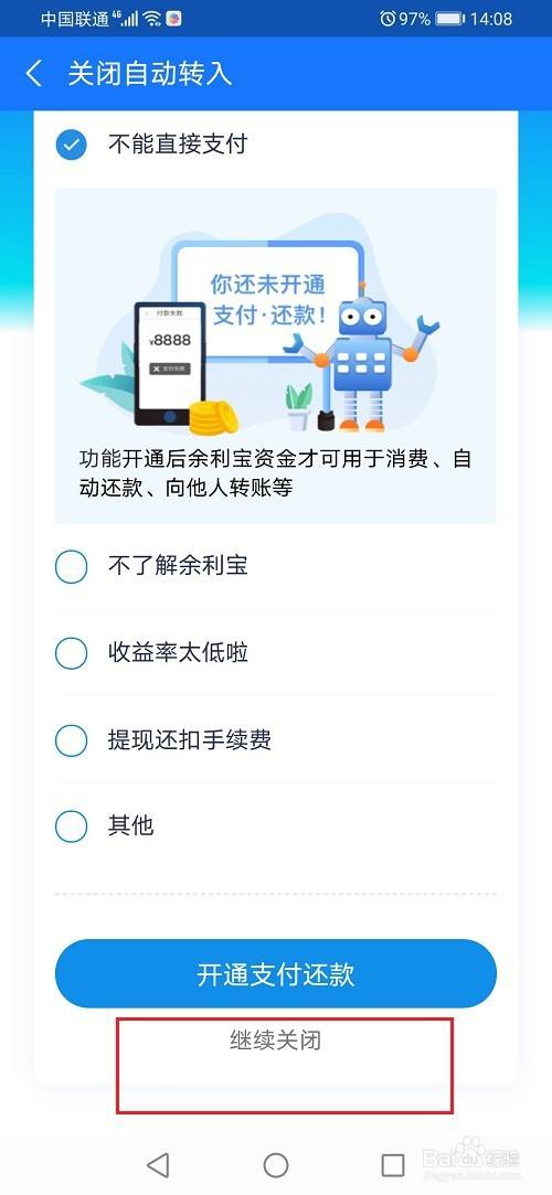 第五步选择一个关闭的原因,点击继续关闭,就关闭了余额自动转入余利宝了