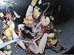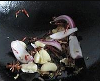 加入辣椒丝,大蒜,生姜,香叶,陈皮,八角,小茴香,桂皮和洋葱