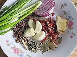 准备好调料,小茴香和大茴香不一样,长得象稻谷,就是下图大蒜下面的