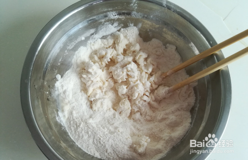 左手拿水碗,右手拿一双筷子,边给盆里的面粉上倒水边搅拌,面粉会逐渐出现面疙瘩。