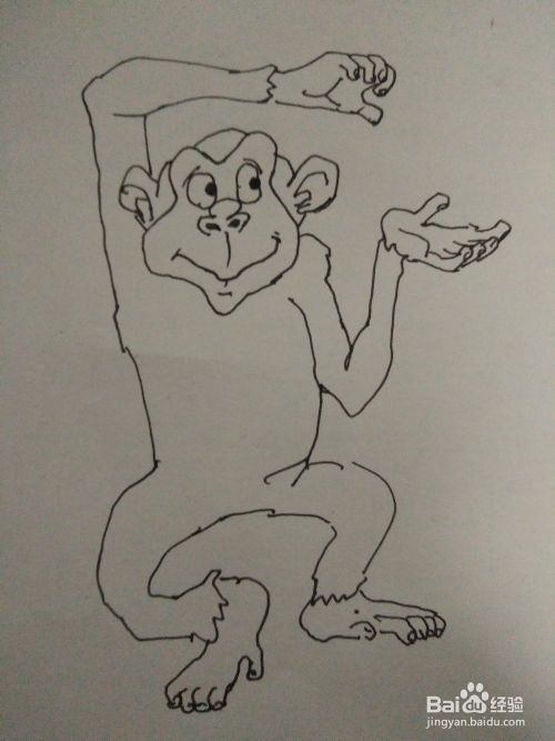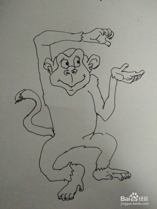 第四步画出卡通大猴子的两只手臂,一只抬起来,一只弯曲。