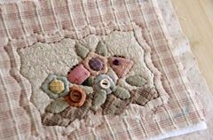 6.完成表布图案贴布以后,将表布铺棉里布三层疏缝压线。里布需比表布和铺棉四周多出3cm左右,用来包边。