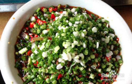 把海椒面和干的青花椒放在泥鳅面上,再撒上葱花和小米辣圈。