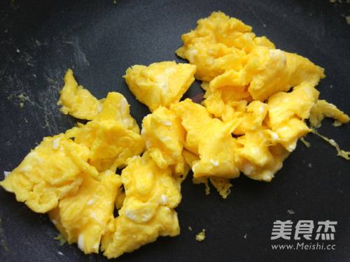 3热锅热油,将鸡蛋小火炒至八成熟,盛出备用。