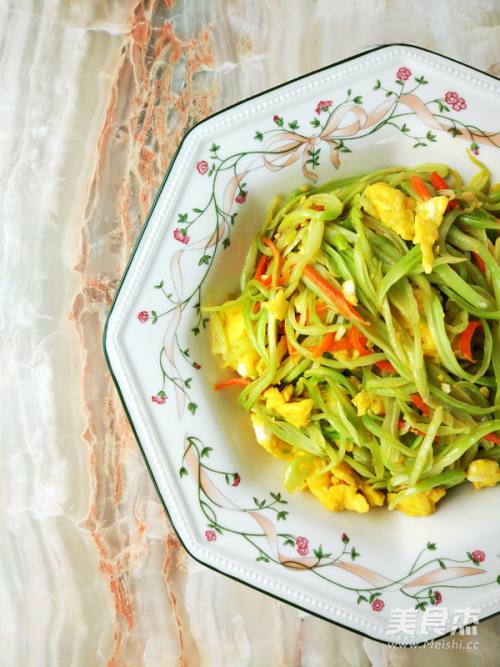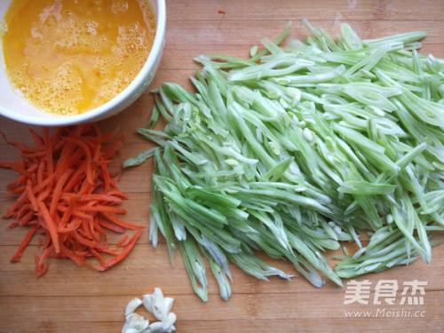 2芸豆斜向切丝,鸡蛋加盐打散,胡萝卜切丝,蒜拍成大块。