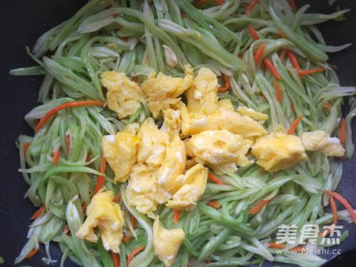 6炒至芸豆丝九成熟,倒入鸡蛋炒匀炒熟,出锅前点少许生抽提味即可。