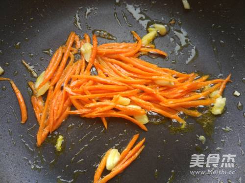4热油爆香蒜瓣,加入胡萝卜丝稍翻炒。