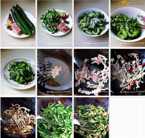 1黄瓜对半切开,然后斜切成片,肉切条、姜切丝蒜切片,红辣椒切成段;