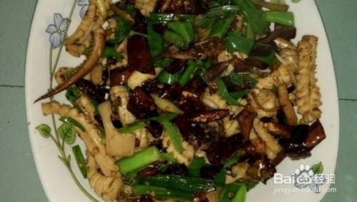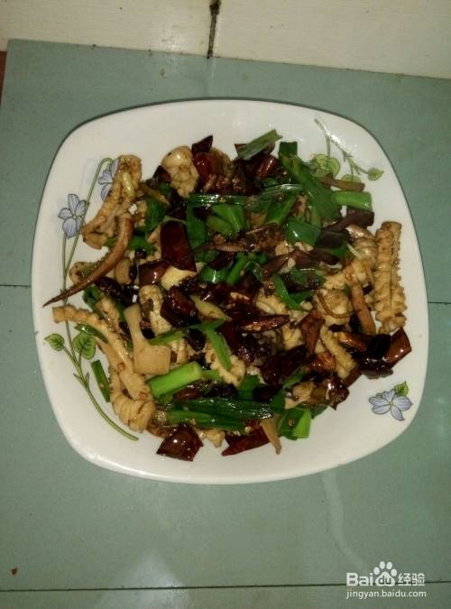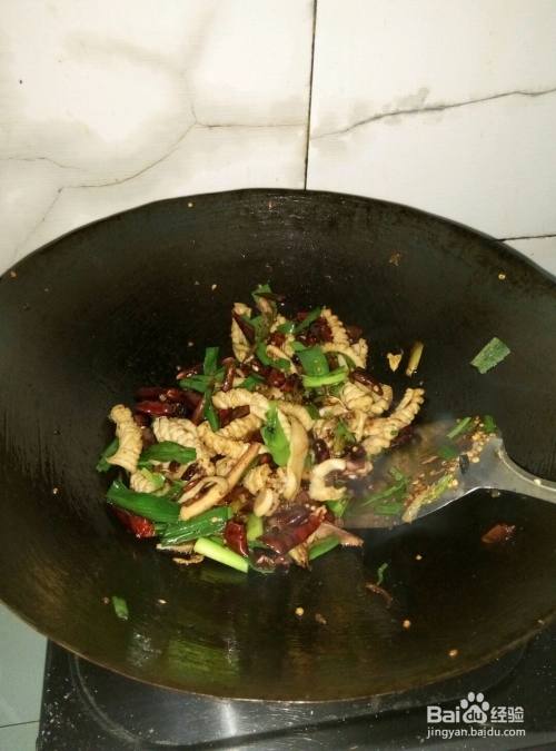 放入鱿鱼,小火翻炒,一直炒到鱿鱼被油煎得噼啪响,切记,一定要小火,不然干辣椒会焦了