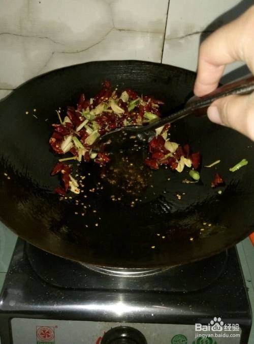 爆出香味后加入干辣椒、花椒,从这里开始要把火调至小火慢慢翻炒