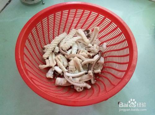 买回的鱿鱼都是切好了的,锅里加入冷水烧开,然后放入鱿鱼,待鱿鱼完全卷边变色后倒出,用清水冲洗,沥水干备用