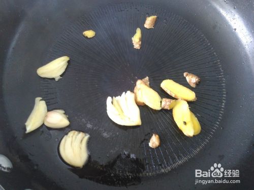 热锅下油,放蒜米、姜片进去爆出香味,鸭肉下锅,加适量的盐。