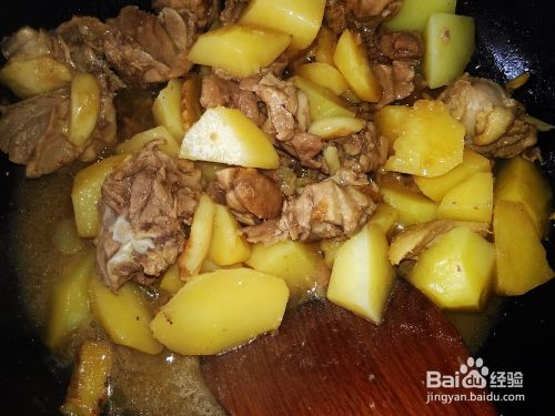 盖上盖子大火煮沸转小火焖10分钟左右,中途翻转一次,非常美味好吃的鸭肉焖土豆就做好了。
