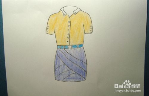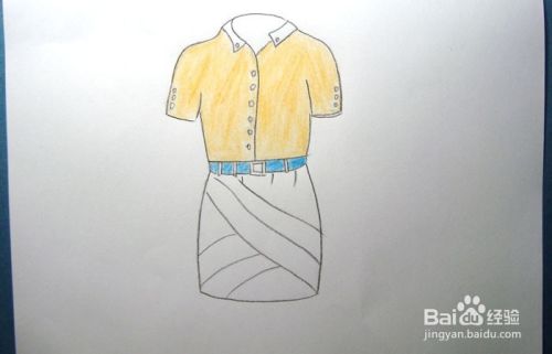 然后,用橙色彩铅笔给漂亮的短袖一步裙的上衣和腰带图形,涂上颜色,如下图所示。