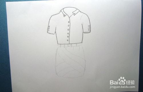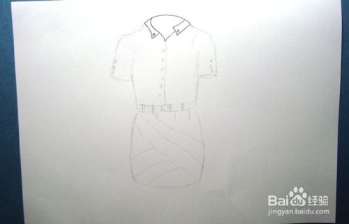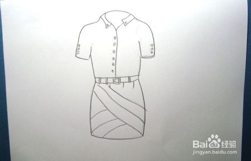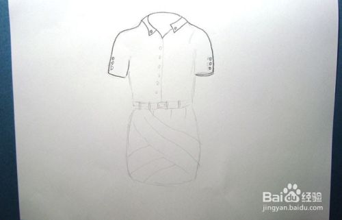 然后,用黑色的彩铅笔画出漂亮的短袖一步裙的上衣图形部分,并画出纽扣图形,如下图所示。