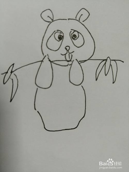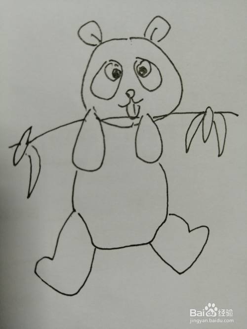 第五步,在可爱的小熊猫的手上画出一根竹子,注意竹子上树叶的画法。