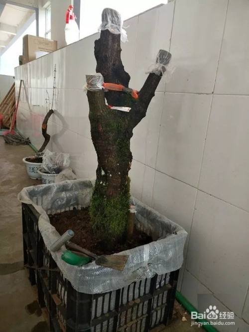 对于枝干的截面,我先是用红霉素涂抹,然后再用农业上常用的塑料薄膜把截面扎好,这两样很重要,红霉素可以消毒杀菌,薄膜封口可防止树桩水分的流失。