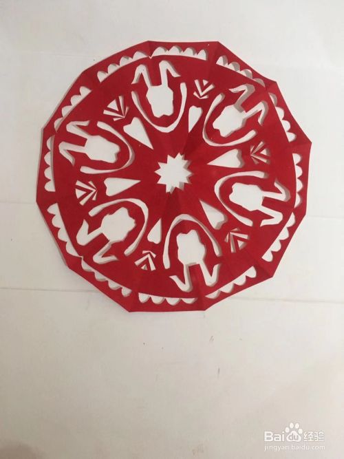 第七步 剪去多余的彩纸之后 再剪小白兔的头部 和胡萝卜以及胡萝卜的叶子 等等空白的地方等等 还有其它小装饰图案 都剪完之后 展开铺平 一副漂亮的小白兔与胡萝卜的团花图案就裁剪完成了