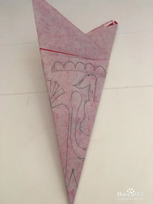儿童手工剪纸 一副漂亮的小白兔与胡萝卜的团花图案 怎样用彩纸折叠 这是一副镂空团花图案 采用六角折剪法 操作如下 预备一张正方形红色彩纸 沿对角线折叠三次 再对折一次 然后再上面画上半个小白兔和胡萝卜 涂实一下不要剪去的地方 最后把空白处剪下即可