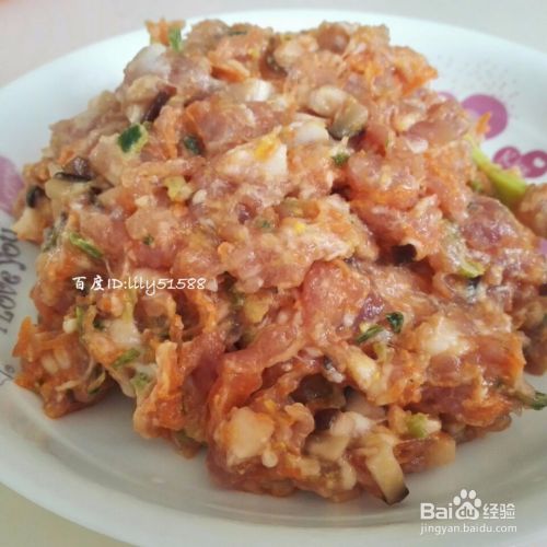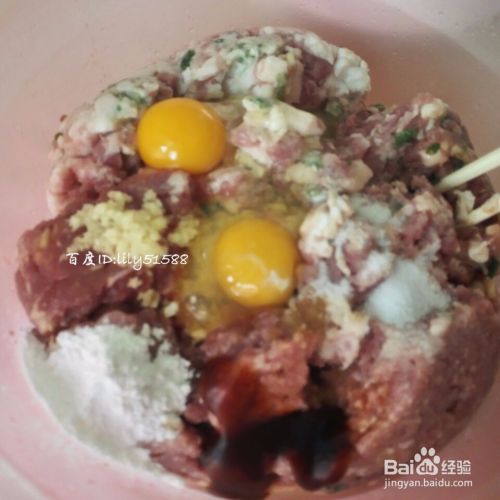 放入相当调味料、生姜、两个鸡蛋,拌匀后。再加入香菇、胡萝卜、芹菜一起拌匀即可。