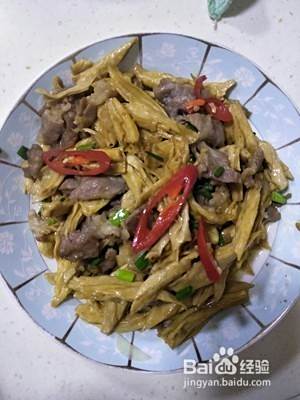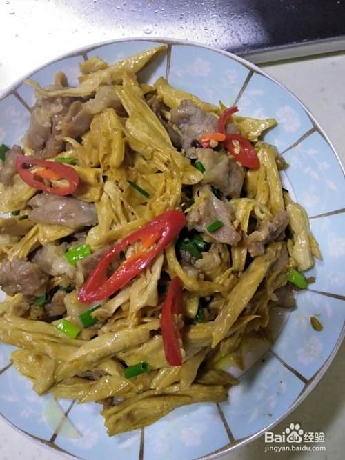 坐锅,烧热,微微冒烟的那种,放油2勺,下肉,猛火快炒,肉变色出锅留油,葱白,姜蒜下锅炒香,放腐竹炒香,把勾兑好的碗汁倒下去,焖一分钟撒葱花出锅,准备一碗米饭开吃吧