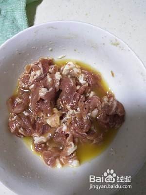 肉是这样的,夹点肥肉的梅头肉 ,切片,先放油,让每一片肉都包裹上油,然后依次放生抽,盐,生粉,拌匀,搅打上劲,腌5分钟。