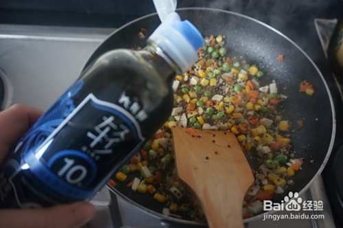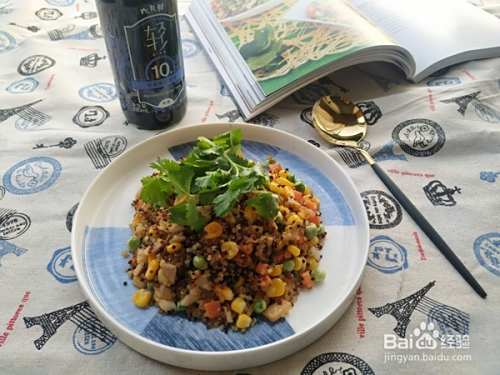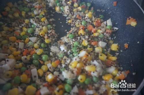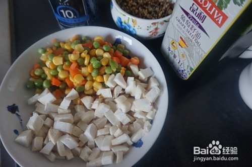 准备食材:杏鲍菇洗净切丁、冷冻蔬菜(青豆粒、玉米粒和胡萝卜丁)、三色藜麦事先煮熟备用
