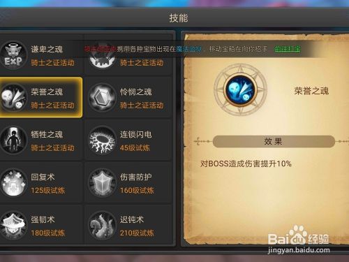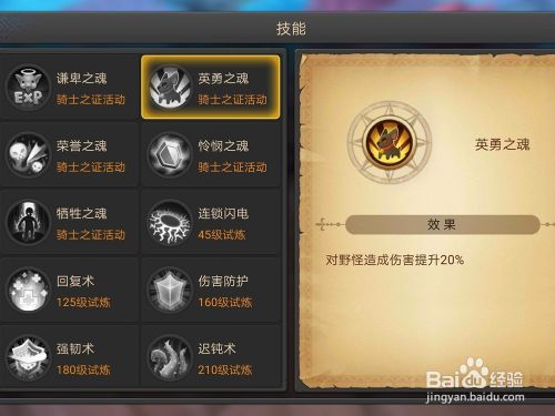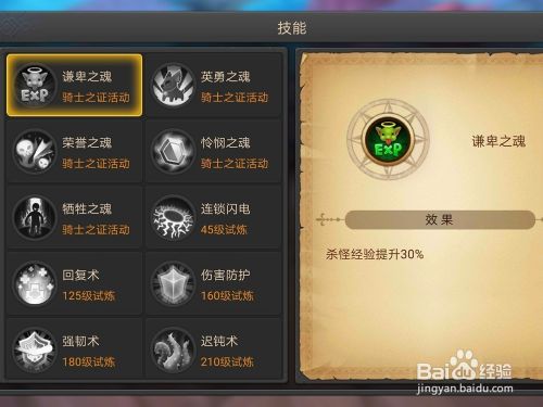 接着点击技能右上角的被动技能,可以查看所有的被动技能,比如说谦卑之魂,可以提高杀怪获得的经验,加快升级速度,适合打怪时使用。