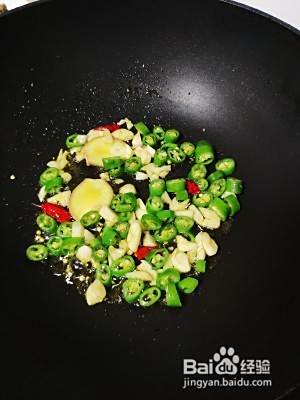 起锅烧油,油热后下姜蒜辣椒爆香。
