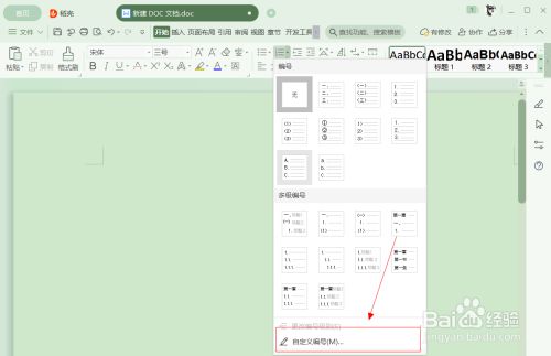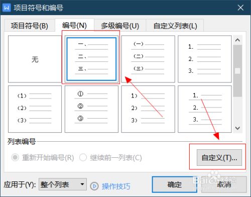 在工具栏中找到“编号”功能,弹出的窗口中选择“自定义编号”。