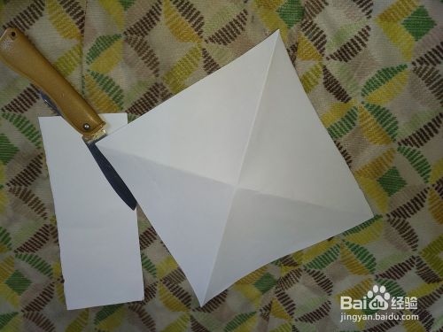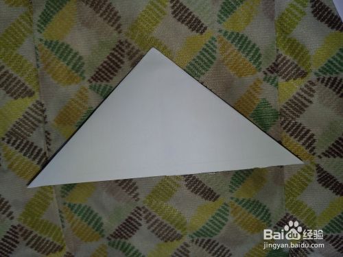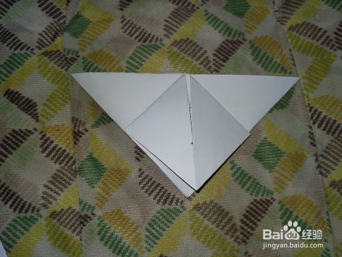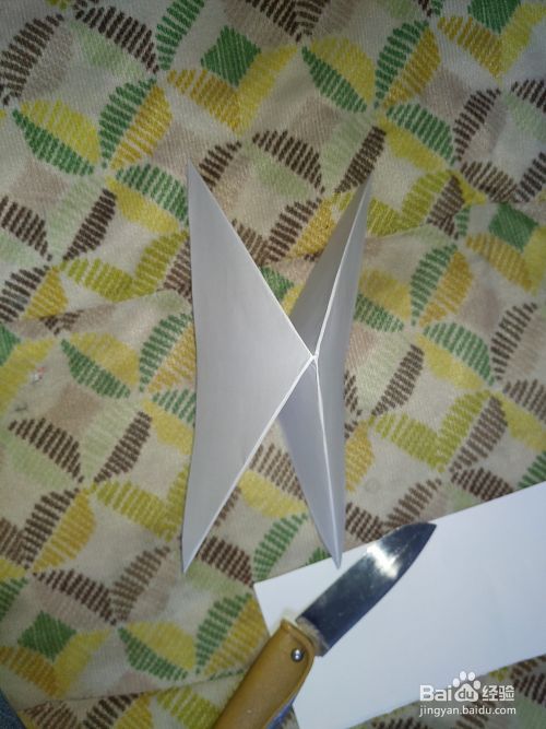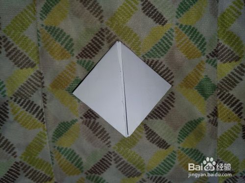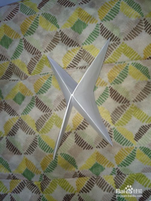 接着沿着两个对角均对折一下,使纸有十字的痕迹。然后,以痕迹为角,把纸折成十字,入图做成一个类似十字的飞镖形态。最后再压实。
