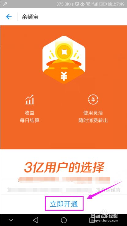 来到了余额宝,我们点击下“立即开通”,如图。