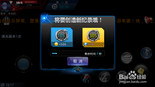 闯关失败后可以选择500金币买10s的时间和10钻石买30s时间。如果不选择可以点击取消。