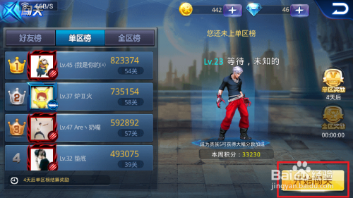 根据每日获得的闯关积分,会进行単区的排名和全区的排名。