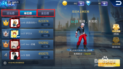闯关模式有三个排行榜--好友榜、単区榜、全区榜。好友榜为自己的好友之间的排榜;単区榜是你选择的小区的排行榜;全区榜为整个QQ大区或微信大区的的排行榜。