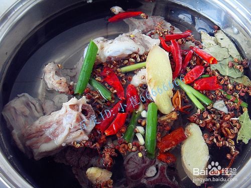 把羊蝎子和准备好的各种佐料放进锅里,同时添入适量的而清水。