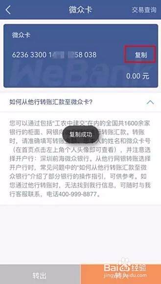 确认身份信息后,在希望开卡的银行转入任意金额到微众卡即可验证成功啦。