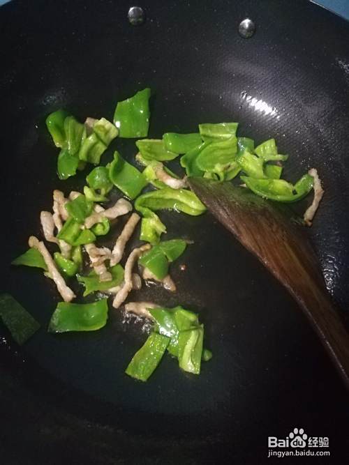 开火后,先炒肉,肉炒熟之后,放入切好的辣椒,翻炒