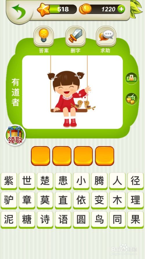 图片中一个小女孩在荡秋千,旁边有两只小鸟,这个图片的暗示有点牵强,但还是可以大概猜出来是小鸟依人的意思