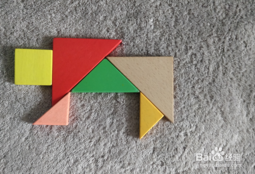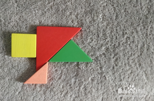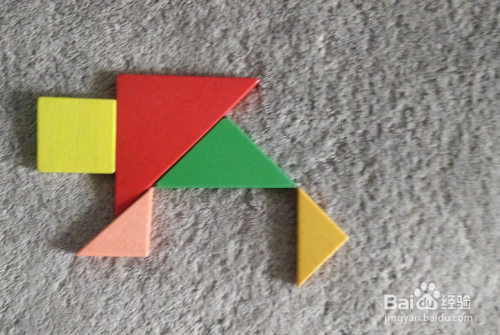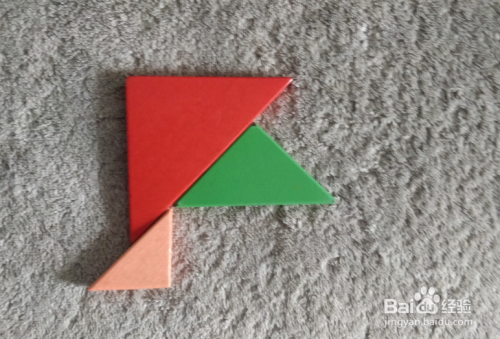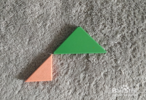 放上绿色三角形,左下放上橙色三角形挨着,如图。