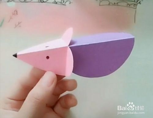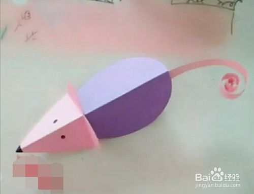 第七,再取一小块长长的彩纸,粘到老鼠的屁股后边,具体操作如下图所示,这样一只可爱的小老鼠就做好啦。