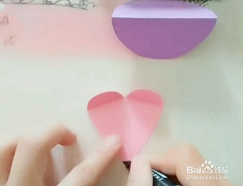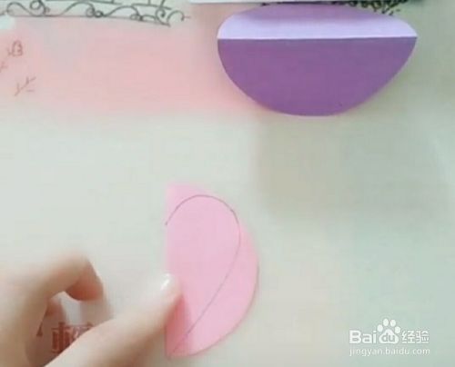 第二,再取另一张圆形彩纸,同样沿中线对折,并如下图所示,在材质上画出一个半心形:
