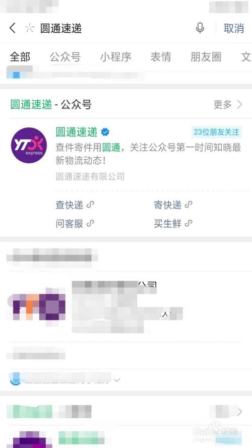 输入“圆通速递”后,在下面会出现一系列相关的搜索项,找到如图所示的“圆通速递—公众号”
