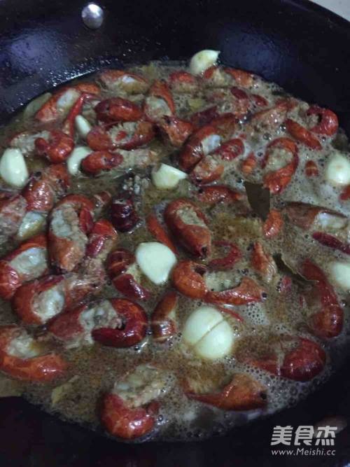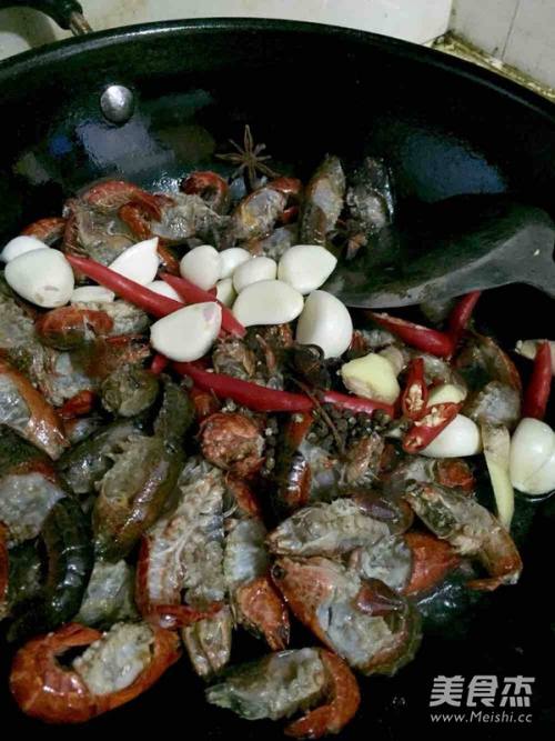 4将油烧热,倒小龙虾入锅翻炒,龙虾变红后,加入生姜,大蒜、小米椒、花椒、香叶继续翻炒出香味。