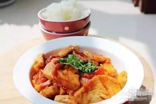 将豆腐切成小块,番功切成与豆腐大小相同的块。